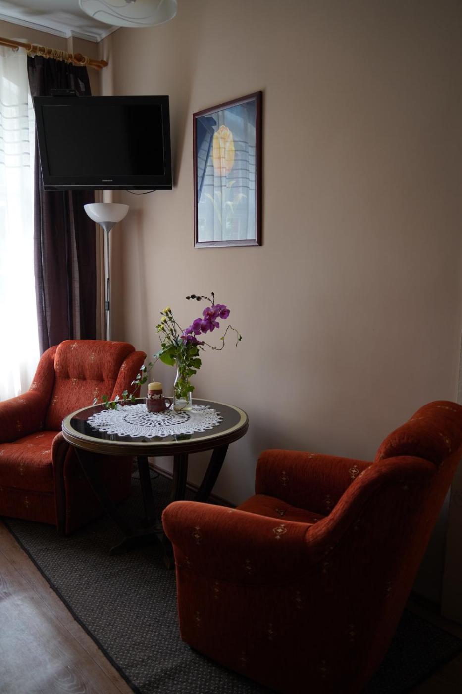 Pokój rodzinny z prywatną łazienką. The family room features a seating area, a dining area, as well as a private bathroom boasting a walk-in shower and a bath or a shower. Guests will find a stovetop, a refrigerator, kitchenware and an oven in the well-fitted kitchen. The family room also comes with a barbecue. Among the room amenities are a wardrobe, a sofa, parquet floors as well as an outdoor dining area and garden views. The unit has 3 beds. Rodzinny - 4 osobowy. Powierzchnia pokoju ok.: 30 mkw. ;