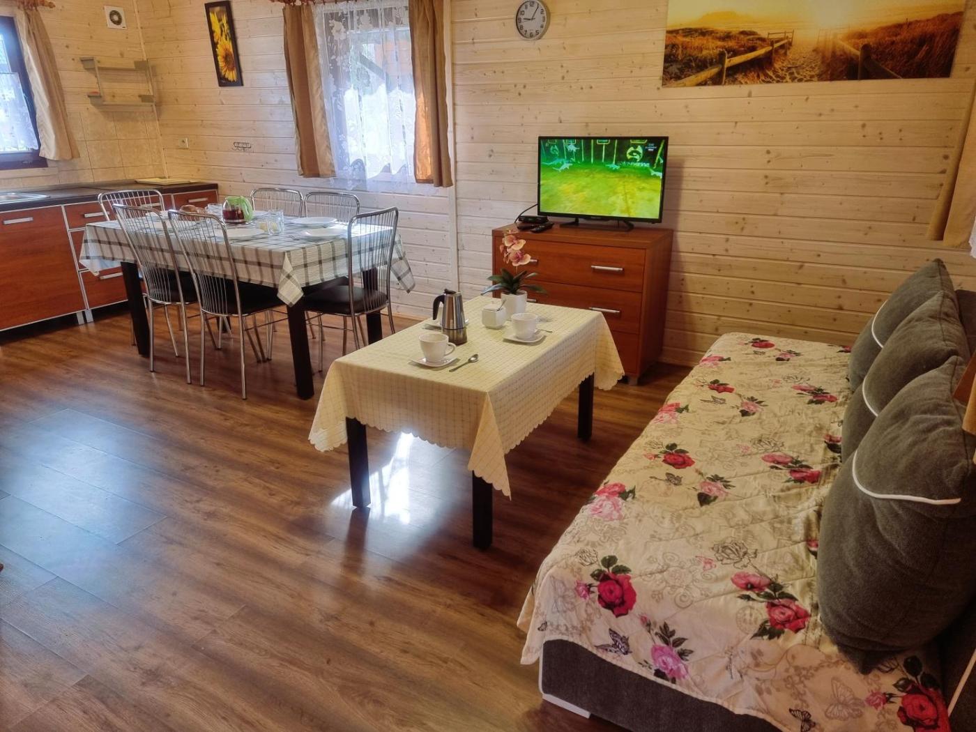 Domek z 2 sypialniami. Boasting a private entrance, this chalet features 1 living room, 2 separate bedrooms and 1 bathroom with a walk-in shower and a hairdryer. Guests will find a stovetop, a refrigerator and kitchenware in the kitchen. The chalet also comes with a barbecue. Featuring a terrace with garden views, this chalet also features a tea and coffee maker and a flat-screen TV with satellite channels. The unit has 6 beds. Domek - 8 osobowy. Powierzchnia pokoju ok.: 70 mkw. ;